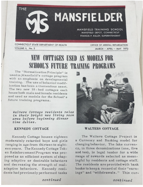 While most of what The Mansfielder spewed out to Connecticut governmental agencies, resident’s families, and other state institutions veered on the line of propaganda, some articles added new life to other documents the research team thought were only dead ends. Before discovering The Mansfielder, I read about new cottages and apartments built by MTS, but found no further information, which led me to believe they simply didn’t exist. However, many of the articles in the publication spotlighted the different out-of-facility living arrangements; their locations, their usages, and which residents were eligible. In addition, the last publication under Kelley’s reign printed out part of his resignation speech, listing what he believed MTS needed to improve on for the future.