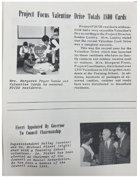 Two editions of the Mansfield Training School’s published newsletter “The Mansfielder.” These two issues span from March through September of 1972, highlighting stories such as the construction of new cottages for residents and a Valentine’s Day card drive. Copies of “The Mansfielder” were sent to institutions across the United States, state government officials, and families of the residents.