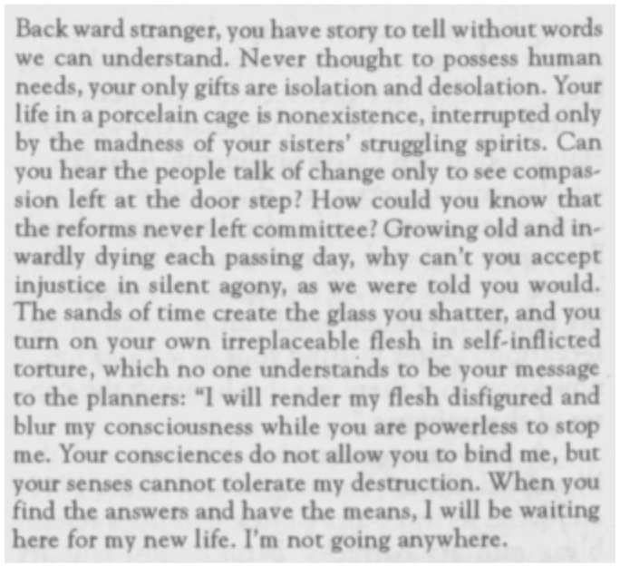 The quote reads: “Backward stranger, you have story to tell without words we can understand. Never thought to possess human needs,your only gifts are isolation and desolation. Your life in a porcelain cage is nonexistence, interrupted only by the madness of your sisters’ struggling spirits. Can you hear the people talk of change only to see compassion left at the door step? How could you know that the reforms never left committee? Growing old and inwardly dying each passing day, why can’t you accept injustice in silent agony, as we were told you would. The sands of time create the glass you shatter, and you turn on your own irreplaceable flesh in self-inflicted torture, which on one understands to be your message to the planners: ‘I will render my flesh disfigured and blur my consciousness while you are powerless to stop me. Your consciences do not allow you to bind me, but your senses cannot tolerate my destruction. When you find the answers and have the means, I will be waiting here for my new life. I’m not going anywhere.’”