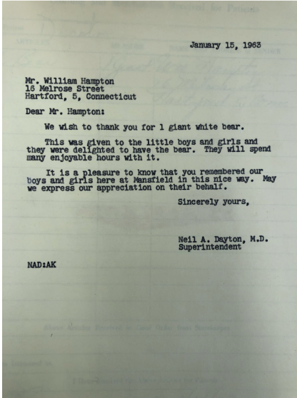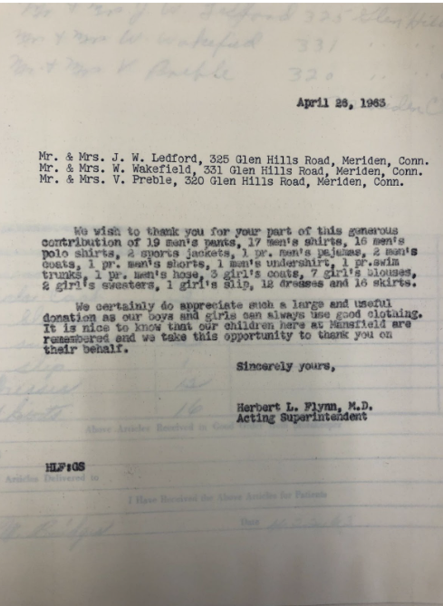By the time I arrived at the Connecticut State Archives warehouse for the first time to begin my work on the MTS Memorial Project, I had already formed a number of expectations as to what I might see kept in those boxes (which included, but were not limited to: government proceedings regarding the institution’s closure in 1993, lots of grainy, black and white photos, and tons of carework guidelines for the facility’s employees). What I didn’t expect, though, was to be handed a box filled with several hundred donation receipts that were maintained throughout the 60s.