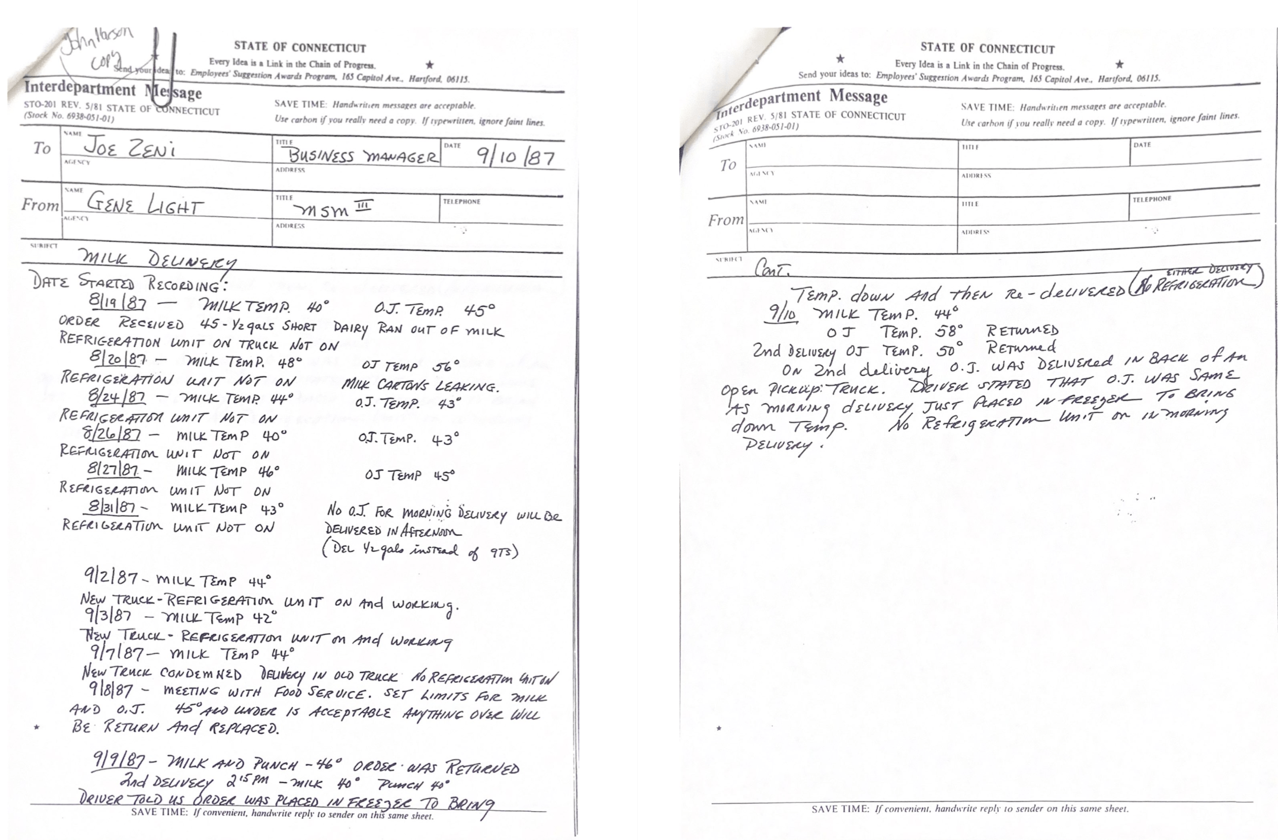 August 17th and 19th, Milk delivered in an unrefrigerated truck (48 degrees-50 degrees) and 9 cases short of product. So, aside from leaking containers, puddles of milk, contaminated products laced with bleach, and melted products—MTS received consistently poor treatment despite their countless complaints to UConn. This list only shows the surface of this continued issue. In files between members of MTS, Gene Light detailed dates when poor-quality products were delivered.