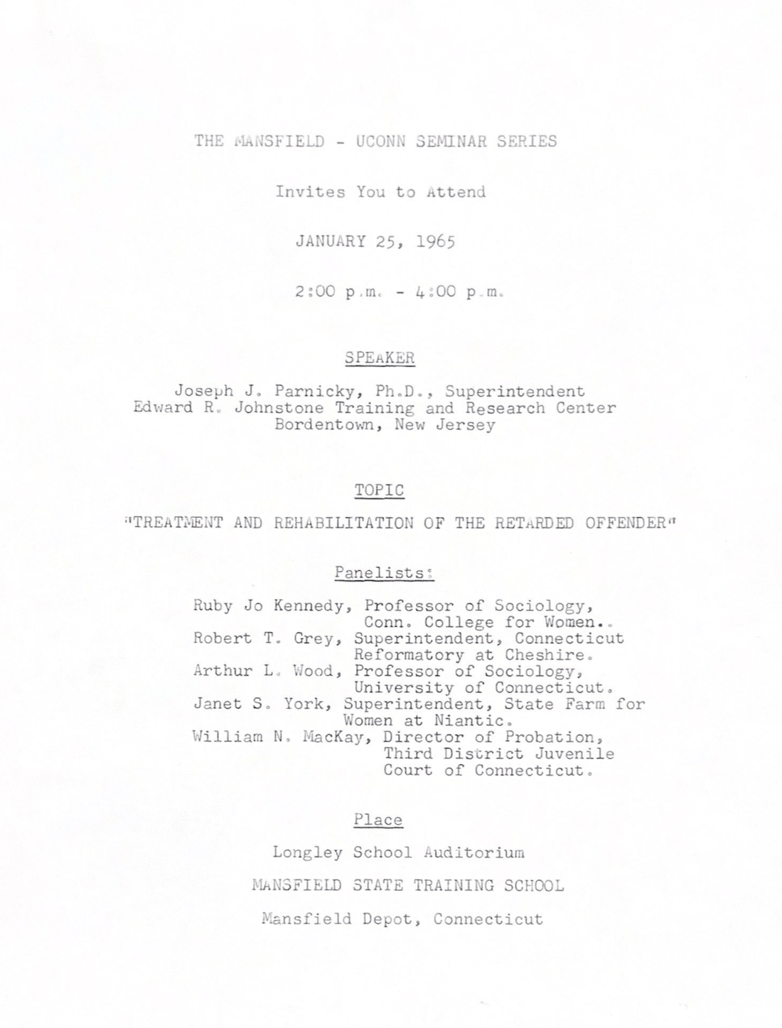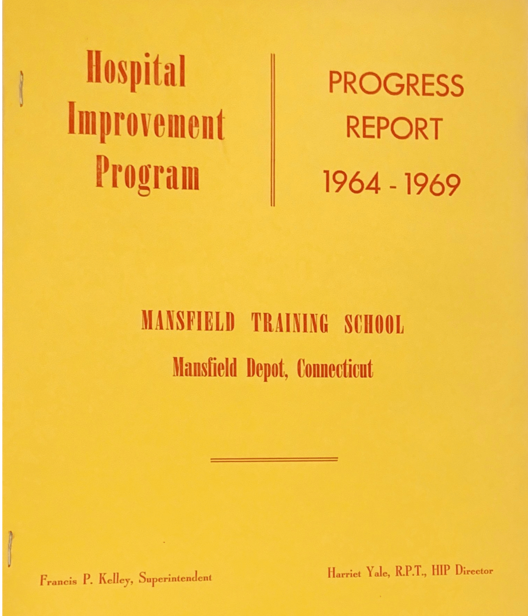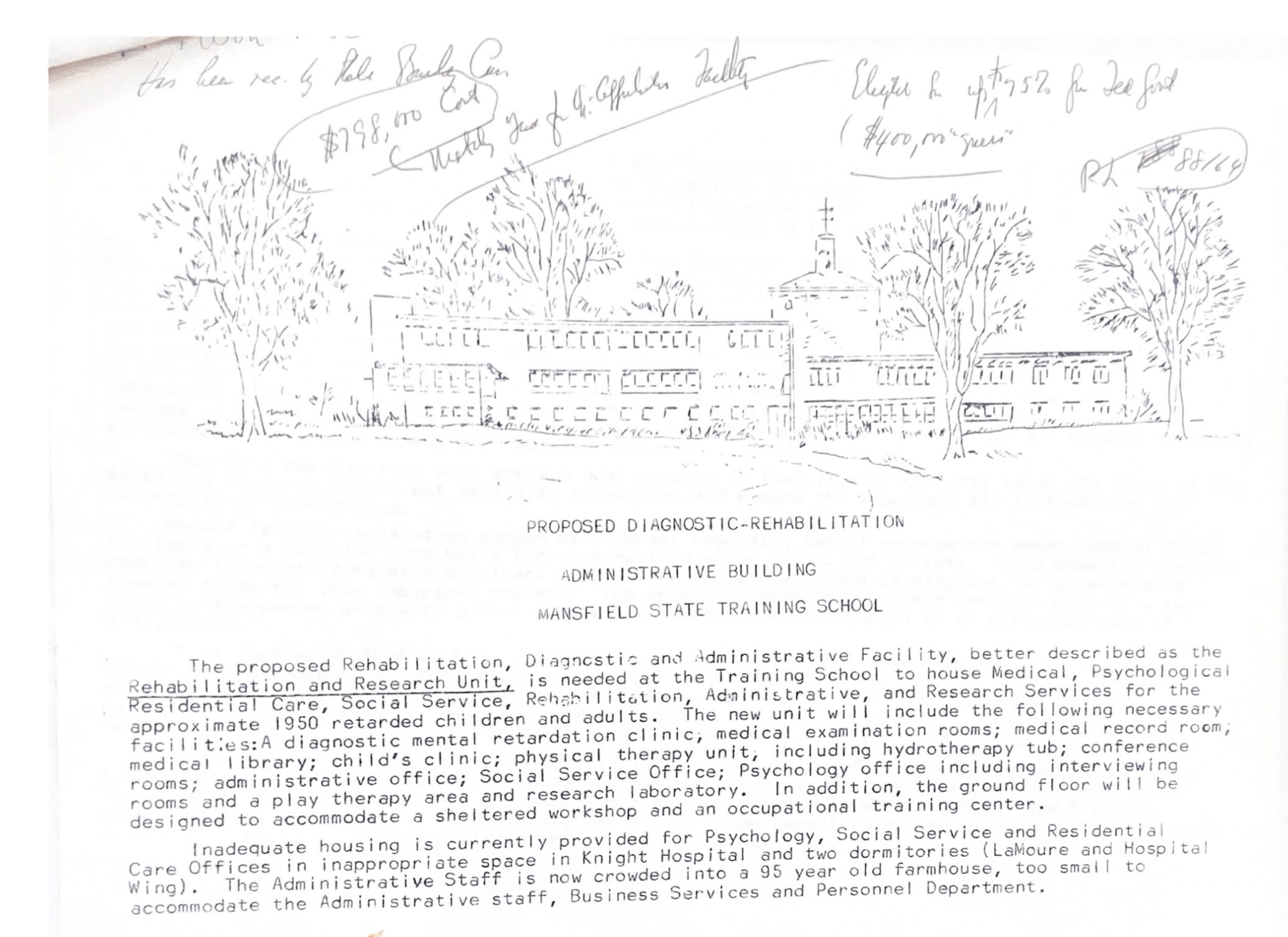 “At the present time, some 19 departments from the University have become interested in […] and are using the Training School facilities and residents in their research and training. Some of the more active programs are Psychology, Education, Home Economics, Child development, Physical Therapy, Social Services, Physical Education, and Speech and Hearing. As a result of this growing affiliation, the University has requested space to expand the cooperative program […] and to accommodate experimental research. A committee of University faculty has indicated a definite need , on the Mansfield Training School grounds for a laboratory classroom; psychology interviewing rooms; observation rooms with one-way vision…Recent federal legislation passed by Congress regarding [intellectual and developmental disability] makes federal funds available on matching fund basis under Public Act 88-164.”