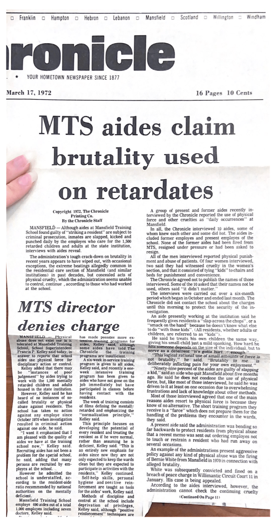 On March 17th, 1972, “The Chronicle” publishes an article titled, “MTS aides claim brutality used on retardates.” After speaking to aides at MTS, it was revealed that many of the employees who cared for the 1,500 residents often slapped, kicked, and/or punched the residents. Though the administration attempted to crack down on the brutality, extreme violence was still common in residential care. Kelley denies these claims and says that aides may use ‘poor judgment’ in these instances. He further states that he is confident in the quality of aides at MTS and has never heard of any reported instances of violence since the institution has had no problems finding quality aides. However, this seems contradictory to the history of MTS and its inability to find permanent staffers. In the women’s ward, two aides witness other staff members tying “kids” to chairs and beds for punishment or convenience. Another male aide, who continued to work at MTS mentioned not knowing what to do with the kids so he would often smack them across the hand. While every resident at MTS is referred to as a ‘kid’ regardless of their age, the infantilization by staff members is a consistent theme seen across MTS’s history as an institution. Another aide mentioned that at least 99% of the aides he has seen at MTS have slapped a resident at one point or another. While the administration attempted to crack down on brutality by instructing aides not to restrain or grab residents that would attempt to escape, there were no policies that were set or individuals to oversee this.
