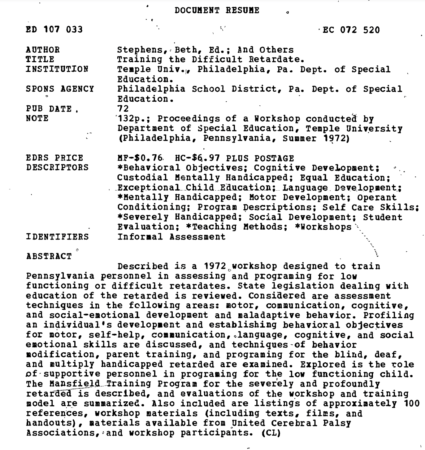 As life at MTS continued to dwindle, Superintendent Kelley spent some of his time hosting workshops and speaking publicly about the work he’s seen at MTS. At Temple University in 1972, Kelley spoke at the workshop listed above, hosted by the Department of Special Education. In his address, Kelley mentioned that language was the biggest barrier in teaching a disabled person since it was “limited or non-existent” (Stephens, Beth, et al). Other obstacles he would go on to cite were blindness, deafness, cerebral deformities, minimal attention span, and interfering behaviors. Kelley does not go on to further explain these factors. It’s clear that to Kelley and MTS, disability is seen as a deficit. For them, he claims that simple tasks can be monumental, thus, the best way to support these individuals is through small residential units, individual attention, trained staff with a high staff-to-resident ratio, and availability of professional consultation—all of which MTS lacked. To have their residents celebrate their success,’ Kelley claims each resident had goals set for them that they could achieve and that MTS would be “observing every increment of success” (Stephens, Beth, et al). So, the question we can now ask is: