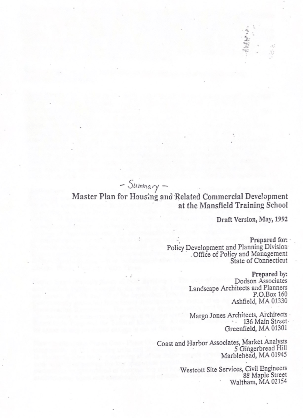 The Task Force recommends that UConn and local recreations such as the Department of Recreations and Greater Mansfield Council of the Arts take control over Longley School—a prime buffer building. The public of Mansfield, should also be able to make full use of the gymnasium in the school and auditorium as part of this agreement, which includes athletic fields adjacent to the school. UConn will also be given access and use of the cottages located on Bone Mill Rd that will be vacated by June 1991. UConn anticipates using these cottages as home offices and work spaces for a number of small study centers scattered across the Storrs campus, including graduate housing. Dimmock, though it has a significant amount of asbestos, like all MTS buildings, will also be given to UConn as well as all remaining farmland lying west of Route 32 and east of Route 32. At the end of this report, the Task Force includes budget proposals for the reuse plan and steps moving forward financially. The Task Force recommended two items: an authorization of $1.56 million to enable DMR to renovate 6 buildings for its long term use of MTS; and, an initial authorization of $8 million for the Department of Public Works (DPW) to cover a variety of costs. This would include renovations to Longley, the Brown buildings, and the Bone Mill Road cottages for UConn’s occupancy, and the removal of asbestos from Dimmock. UConn has also estimated that 7 positions and $284,000 in operating costs will be needed in 1991 as they have agreed to assume public safety responsibilities at MTS that previously fell to DMR. While there is no further talk of money transfers to UConn for MTS, it seems interesting to note the State’s consideration of spending such a large amount of money on the reuse of MTS when, for decades, the institution had been filing for basic renovations of their decaying buildings that residents were forced to inhabit.