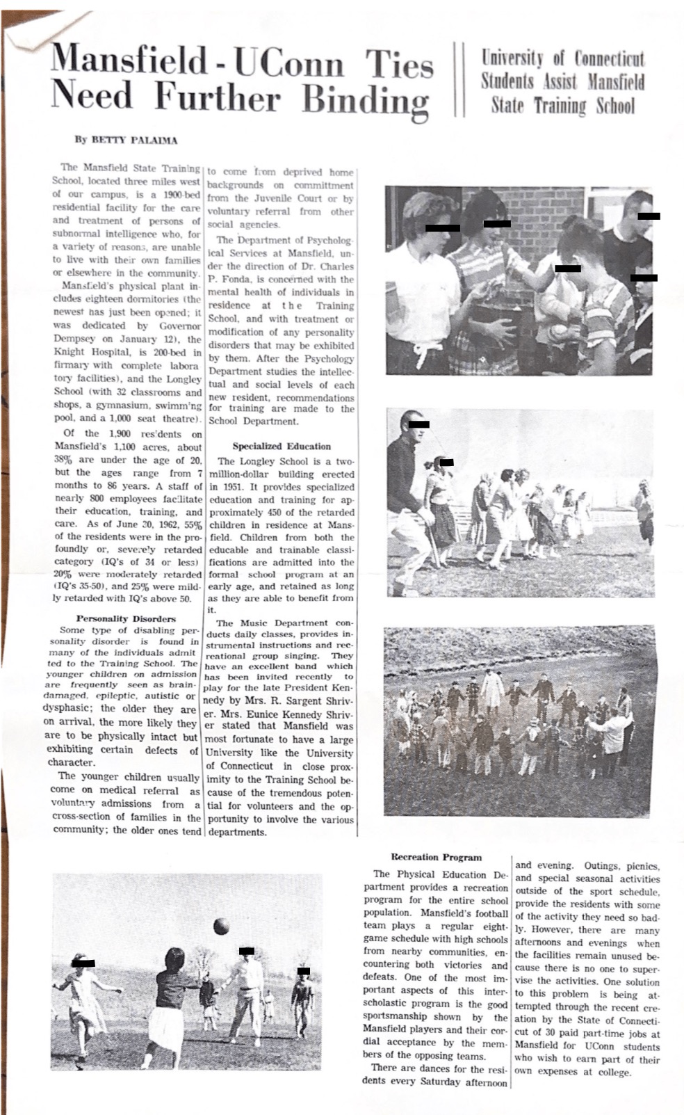 In a short introduction, Kelley proposes that the people of MTS need companionship and people who can come in and spend time with these residents. Thus, the birth of a student companion program is born. The match between UConn and MTS as a partnership between two schools is then born from the mutual need for volunteers and close proximity. While the intention was to provide care and kinship, other members of the UConn community began to quickly become involved in MTS for other reasons. Some of these members include: Professor Alvin Liberman, David Zeaman, and Sam Wytrol of the Psychology department; Eleanor Lucky of the Child Development and Family relations department; Ingeborg MacKellar of the Foods and Nutrition department; Thomas Mahan and John Tenney of the Education department; Earl newcomer of the Botany department; Raymond Pichey of the Social Work department; Gene Powers of the Speech department; Frances Tappan of the Physical Therapy department; George Van Bibber of the Physical Education department; and many other faculty members. In order to garner more volunteers, Kelley announces that many of the young teenage girls would also appreciate guidance from UConn’s female students on things such as personal care and homemaking. And with that, MTS opens itself up to UConn students for tours and visitations upon scheduling with them ahead of time. This article is one of the first public calls that UConn will receive and reciprocate from MTS, as future planning and work with the institution reveal many ways UConn can profit from their research and work with disabled identities.