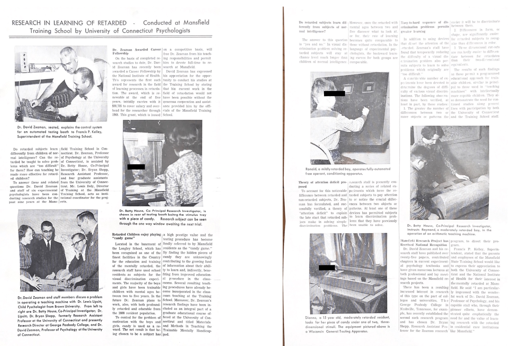 In the basement of Longley School, the research team used the school residents as subject for their visual discrimination experiments. In order to keep the ‘motivation’ of the boys and girls he worked with, he used candy as a reward. In the ‘game’ they would play, the residents would find hidden pieces of candy which Zeaman would use to rank different ways in which they learned to advance strategies for teaching disabled children in the classroom. MTS would then incorporate these findings into the children’s education and alter their curriculum for the sake of Zeaman’s research. Moreover, it seems that Zeaman’s findings were also included as an integral part of UConn’s graduate program through a course titled “Materials and Methods in Teaching the Trainable Mentally Handicapped.”